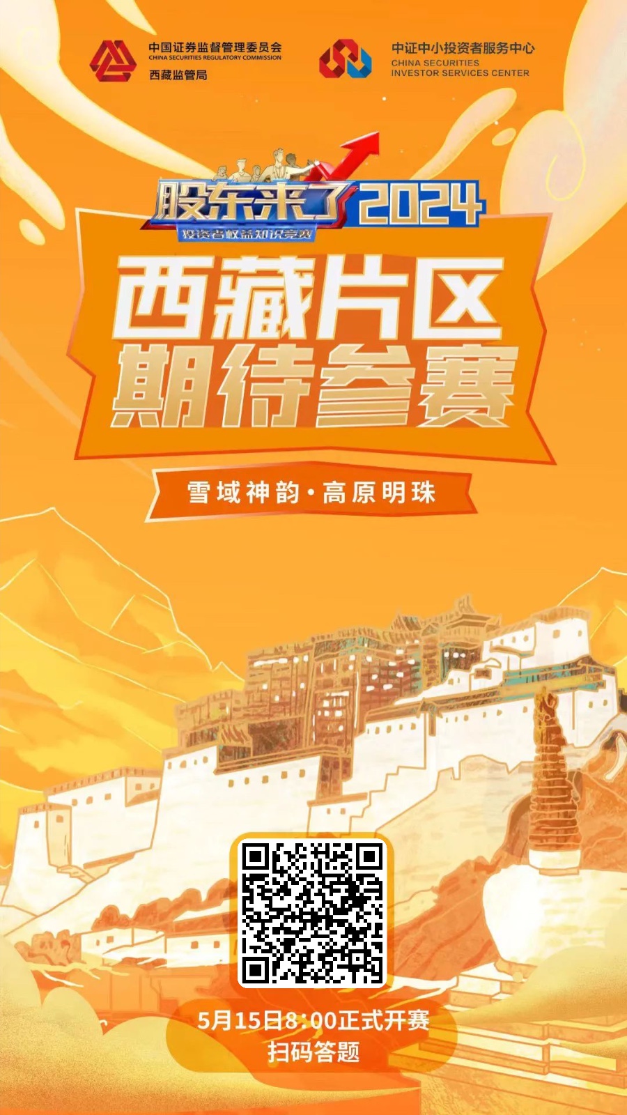 由中证中小投资者服务中心主办,上海、江苏、西藏、深圳证监局联办的《股东来了》-2024投资者权益保护知识竞赛活动于5月15日正式启动。本次活动采用网络答题方式,分设上海、江苏、西藏、深圳四大片区,扫描下图二维码即可参与“西藏赛区”答题活动,请全体同仁踊跃注册并积极参与。